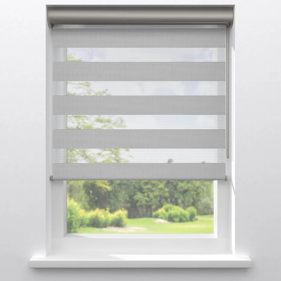 Duo rolgordijn Dean is in de kleur grijs. Door middel van de polyester stof die is opgebouwd uit transparante en ondoorzichtige stroken, in combinatie met een ketting-systeem, kun je de lichtinval en privacy gemakkelijk bepalen in jouw woonkamer of keuken. Dankzij de stofeigenschappen van polyester is het duo rolgordijn makkelijk schoon te maken met een vochtige doek.
