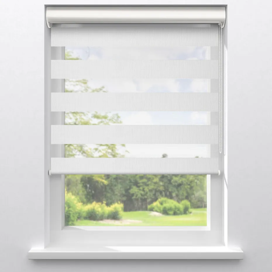 Duo rolgordijn Dean is in de kleur wit. Door middel van de polyester stof die is opgebouwd uit transparante en ondoorzichtige stroken, in combinatie met een ketting-systeem, kun je de lichtinval en privacy gemakkelijk bepalen in jouw woonkamer of keuken. Dankzij de stofeigenschappen van polyester is het duo rolgordijn makkelijk schoon te maken met een vochtige doek.