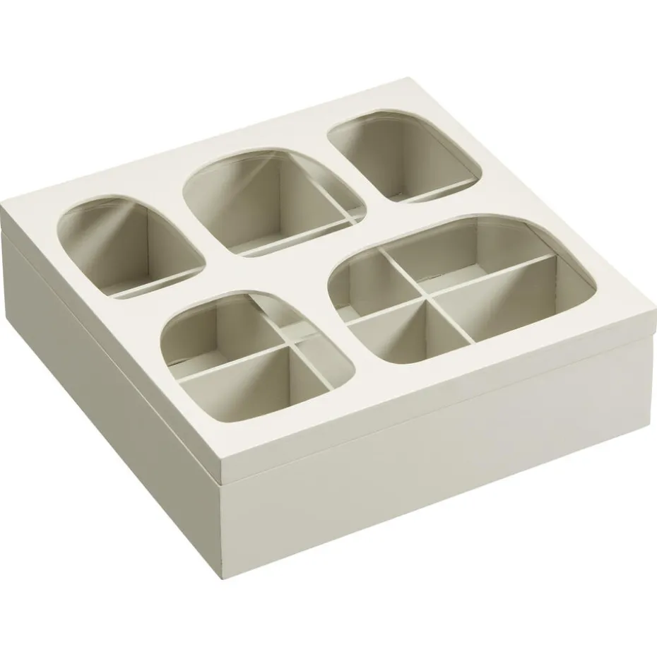 Ontdek deze prachtige Cave theedoos van off-white hout met een glazen bovenkant. Met 9 verschillende vakjes biedt deze houten theedoos de perfecte opbergoplossing voor je theevariëteiten.