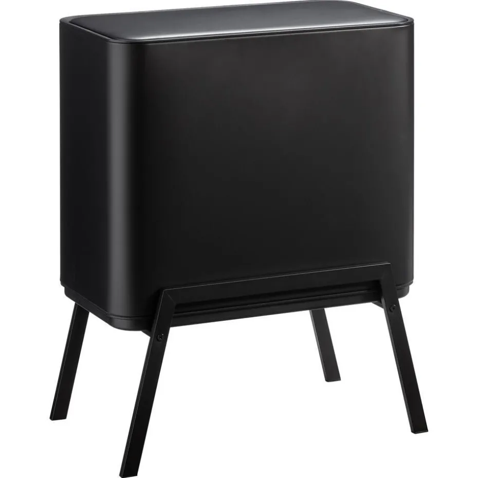 Deze afvalemmer op pootjes heeft 3 verschillende prullenbakken met een inhoud van 28 liter, 12 liter en 5 liter in een moderne zwarte kleur. Deze prullenbak is gemaakt van metaal en heeft een afmeting van 56x34x70 cm (lxbxh).