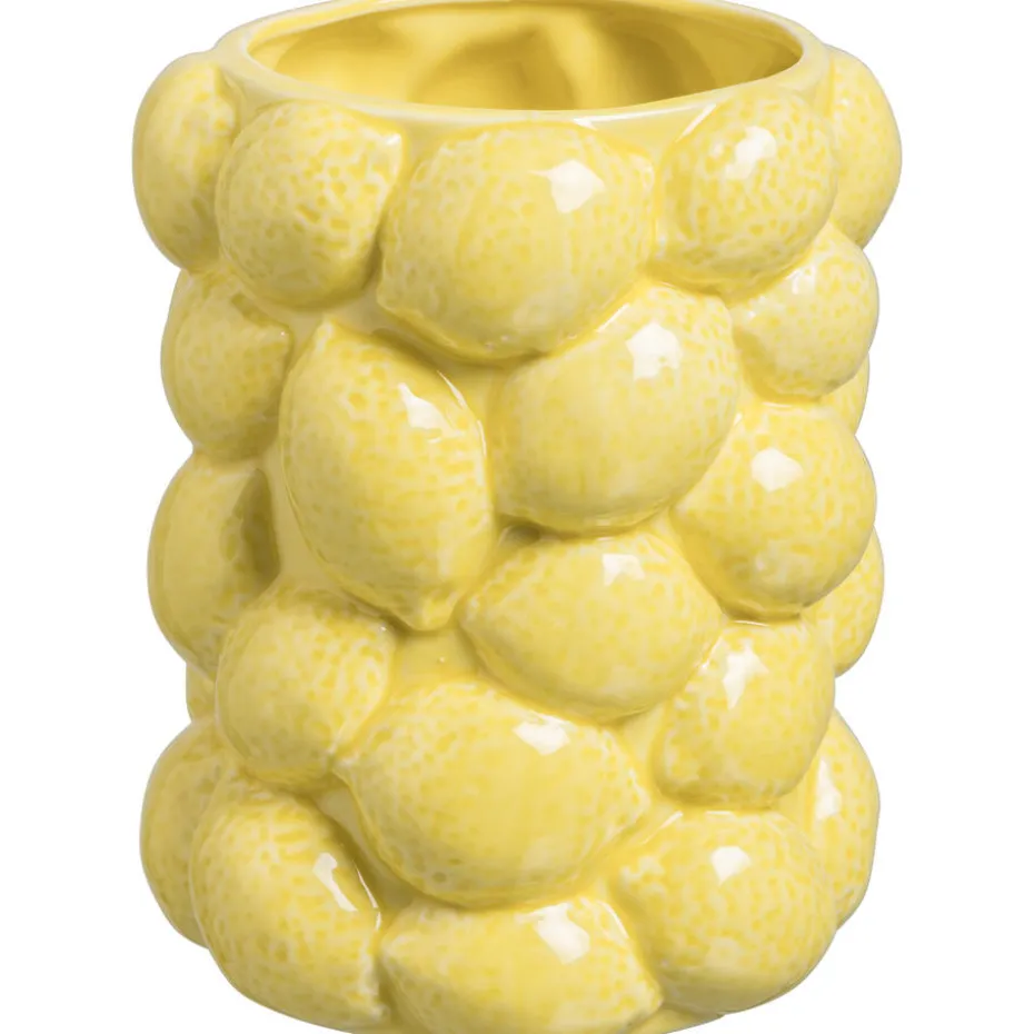 Deze moderne vaas in een warme gele tint brengt een sfeervol accent in elk interieur. Geïnspireerd door de frisse uitstraling van een citroen, straalt hij zomerse energie uit. Gemaakt van aardewerk, heeft de vaas een stijlvolle en natuurlijke uitstraling. Perfect voor bloemen of als decoratief object, een echte eyecatcher in huis.